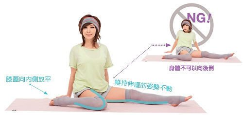 将骨盘座放置如右上图,将双腿伸直趴着。双手重叠将下颚靠在双手上方。双脚打开与肩同宽。