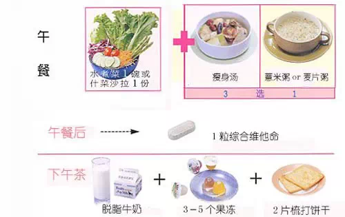 午餐后记得补充符合维他命。在飢肠辘辘的下午可以喝脱脂牛奶(或无糖豆浆1杯),苏打饼乾1~3片,还可以吃1~2个果冻,当然要注意它的含糖量~