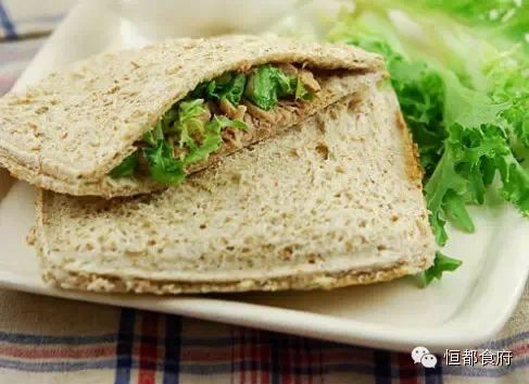 5.涂抹上沙拉酱,放上金枪鱼碎和苦菊碎。